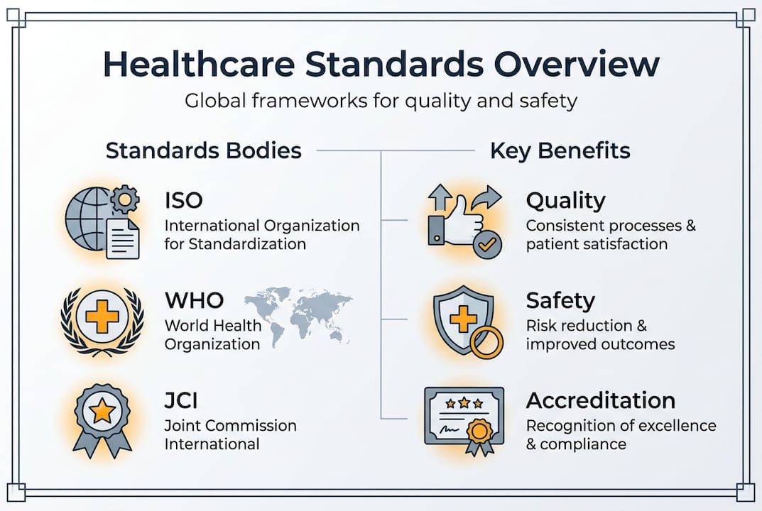 | Core standards bodies | ISO, WHO, and JCI define the foundations for quality and safety in healthcare globally. |